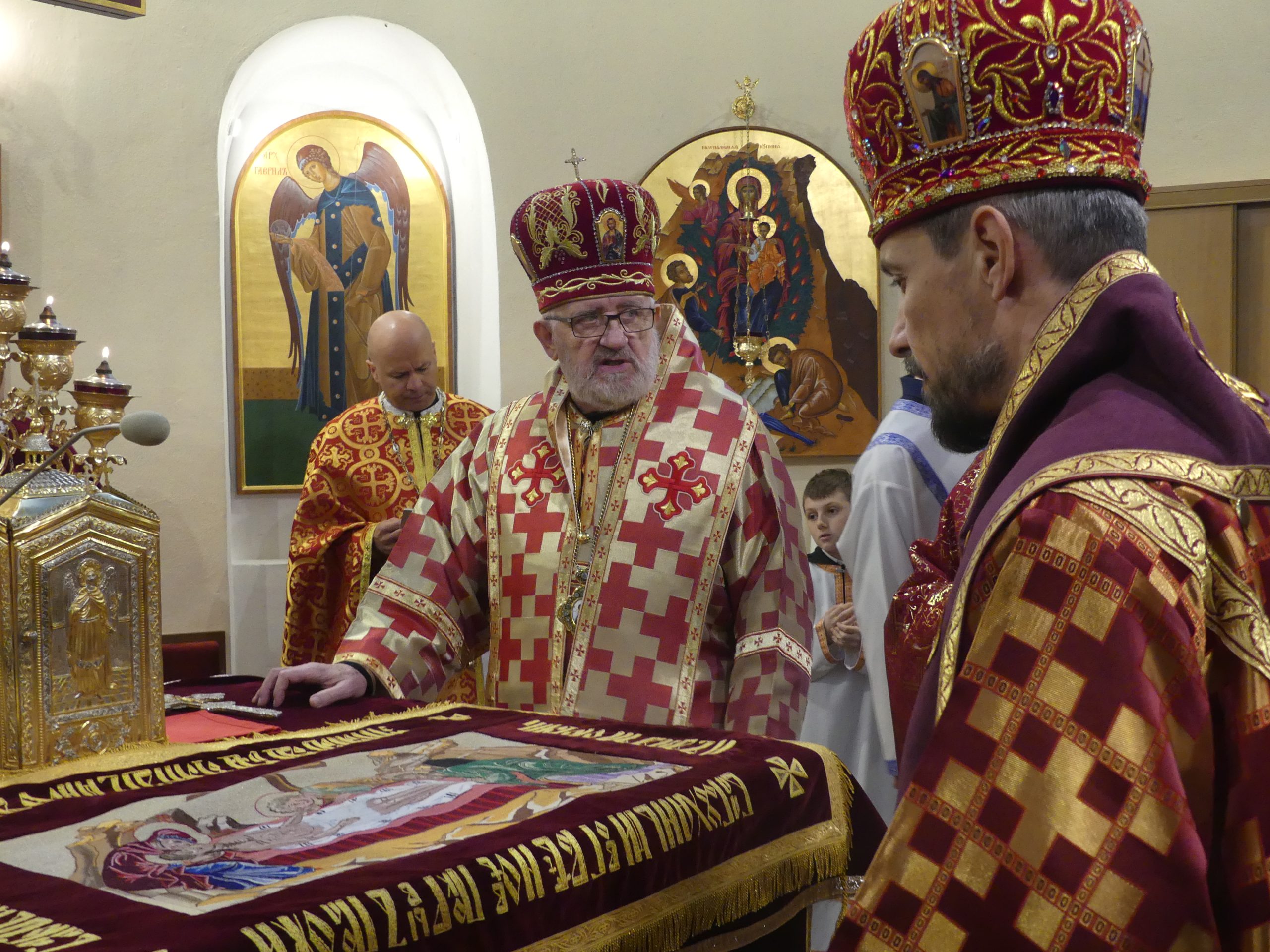 Poobede o 16.00 predsedal vladyka Peter obradom veľkopiatkovej večierne spojenej so sprievodom okolo chrámu s plaštenicou a jej následným uložením uprostred chrámu. Prítomný veriaci si potom poklonou a bozkom uctili plaštenicu, symbolizujúcu plachty, do ktorých bol Ježiš zabalený a uložený v hrobe.