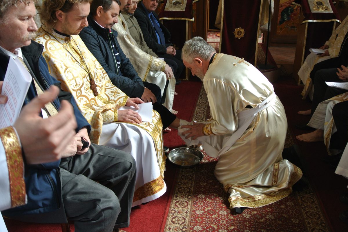 Obrad umývania nôh. Na záver liturgického slávenia sa konal obrad umývania nôh, ktorý je vyhradený vo východnej cirkvi iba biskupovi. Po speve veršových sloh zaznela perikopa z Jánovho evanjelia o umývaní nôh apoštolom pri poslednej večeri, počas ktorej vladyka umyl nohy šiestim kňazom a šiestim laikom (z bratislavskej farnosti). Ako poslednému umyl nohy protosynkelovi, o. Vladimírovi Skybovi, ktorý predstavoval apoštola Petra. Po sv. liturgii nasledovalo agapé, ako vyjadrenie bratského spoločenstva kňazov a veriaich so svojim biskupom. Kňazi si nakoniec prevzali myro a rozišli sa do svojich farností na západnom a strednom Slovensku, v ktorých budú sláviť obrady Paschálneho trojdnia.
