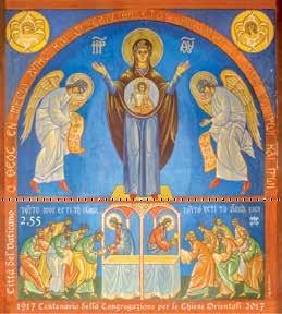 Kaplnka kongregácie vznikla na požiadavku veľkého kardinála, Eugena Tisseranta, ktorý ju viedol práve v rokoch vojny, kedy sa v Ríme zišli Rus Sofronov i Holanďan Leussink OSB. Pán požehnal ich námahu a Kongregáciu zdobí od tých čias prekrásna byzantská kaplnka. Záprestolná freska Krista, rozdávajúceho Eucharistiu zas prostredníctvom poštovej skrze známky hovorí svetu o kráse, ktorá, ako to píše i Dostojevský, spasí svet.