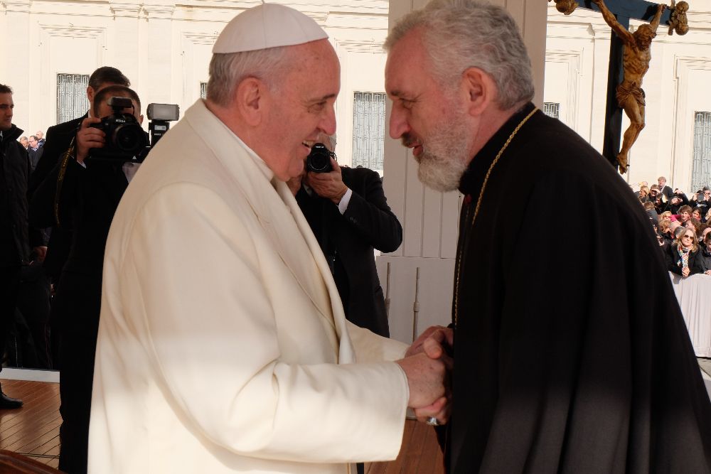 vl_Peter_p_Francesco_4043-03967Bratislava – Bratislavský eparcha, vladyka Peter (Rusnák) sa dnes (17.2.) vrátil na Slovensko z Ríma, kde viedol Piatu Púť laikov k hrobu sv. Cyrila.